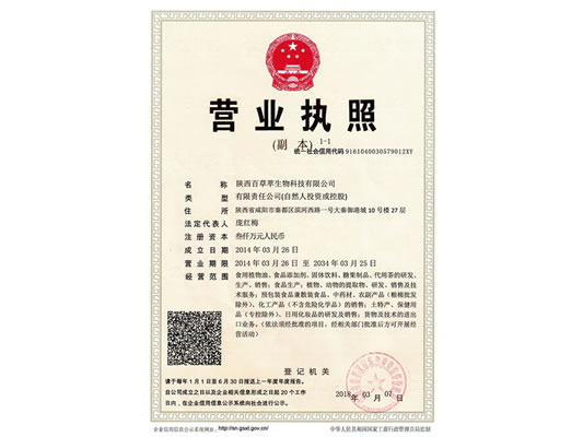陜西百草萃生物科技有限公司,位于陜西省咸陽市秦都區濱河西路1號大秦御港城,公司成立于1996年,主要從事天然植物種植、研發、生產、加工、銷售為一體的高科技企業。主營醫藥原料、保健品原料、化妝品原料,精細化工原料。公司致力于人類健康保護事業“ 以科技為動力,以質量求生存” 的本質,依托陜西高新科技技術人才和科研優勢,已形成多學科、全方位、高層次的技術管理精英團隊。充分利用秦巴山區的天然藥物資源,歷經多年發展為打造百草萃生物品牌奠定了基礎。